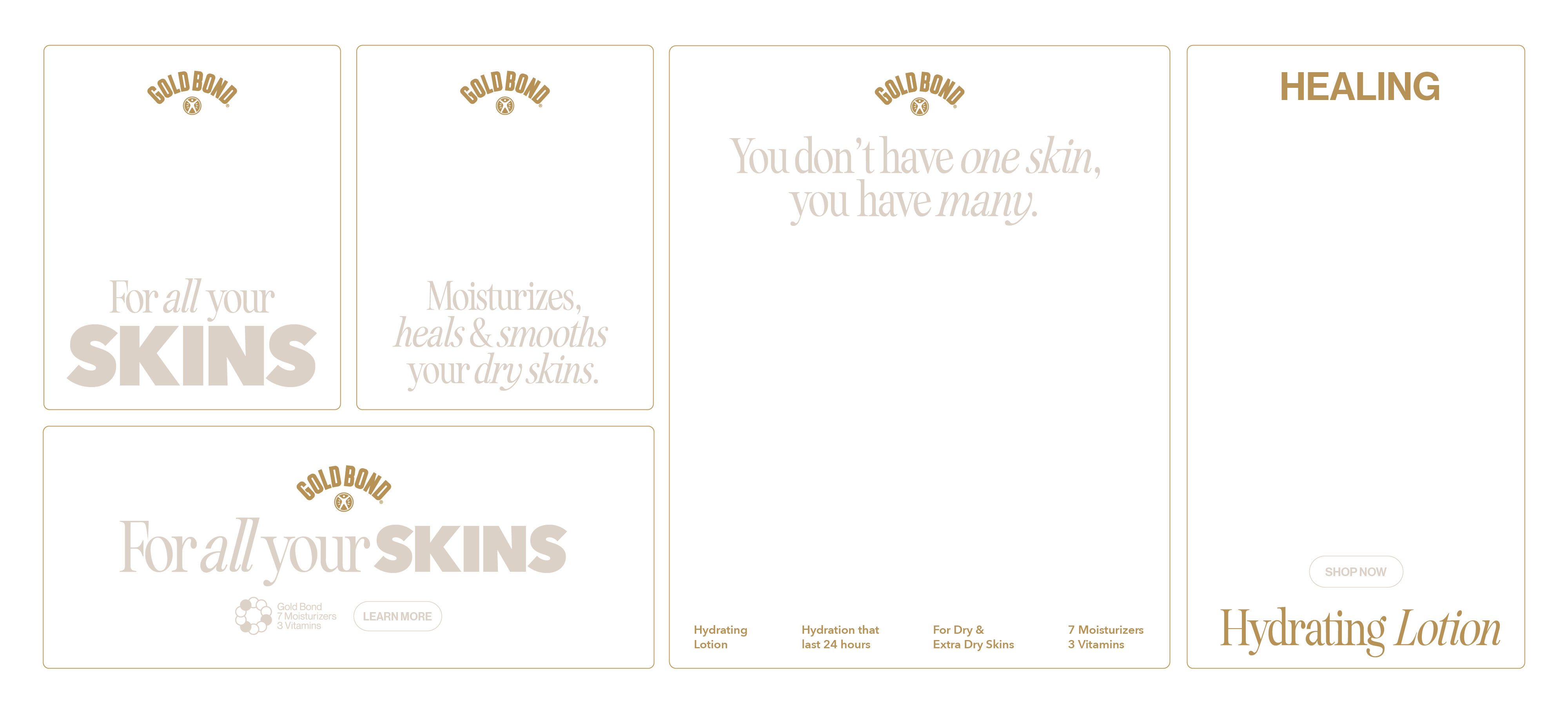 Every Gold Bond product is scientifically formulated for unique skin types, so we set out to visually capture them all. Representing and celebrating not just healthy skin, but also reflecting the beauty and reality of bumpy, dry, and damaged skins as well, a first for the category.